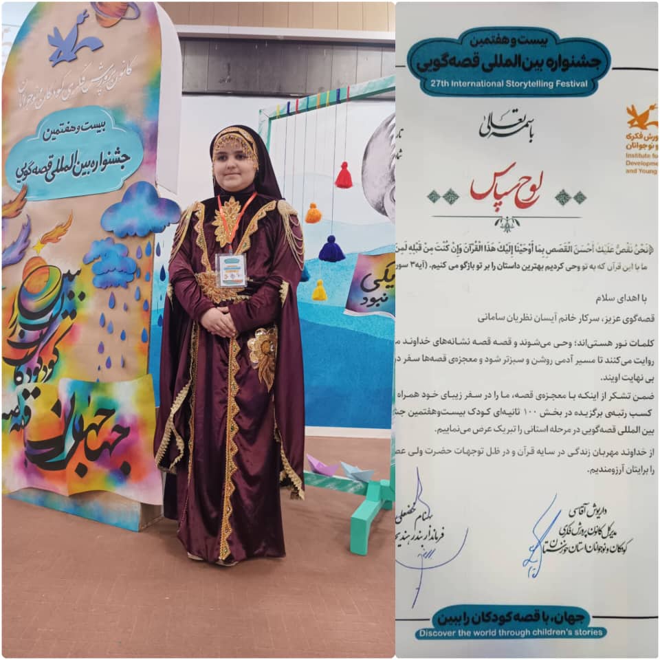 دربیستوهفتمین جشنواره بینالمللی قصهگویی کانون پرورشی و فکری استان خوزستان که در شهرستان هندیجان در تاریخ ۲۴اذر ماه۱۴۰۴برگزار گردید آیسان نظریان سامانی در بخش قصه گویی نهایی موفق به دریافت رتبه برگزیده استانی در این جشنواره شد.